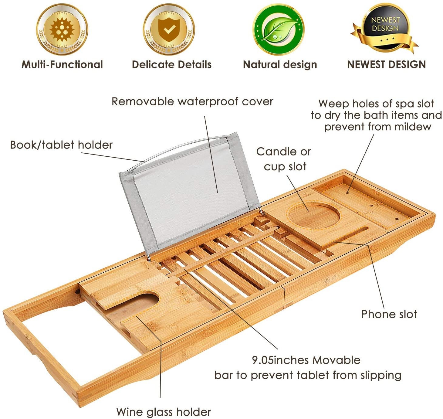 Teak Bathtub Caddy With Reading Rack Item# / Bathtub Caddy Bamboo With Extending Sides Reading Rack ... - The bamboo bathtub caddy is adjustable to fit any tub or jacuzzi.. This bathtub tray is the only one on this list made of stainless steel. It has removable and adjustable holders that can hold your tablet,magazine,or book. Our tub caddy comes equipped with a rustproof metal reading rack that holds tablets and books safely. Features reading tray with book or tablet holder, wine glass and phone holder, center notches keep reading materials upright and elevated. Expandable bathtub caddy adjust to fit most standard bathtubs.