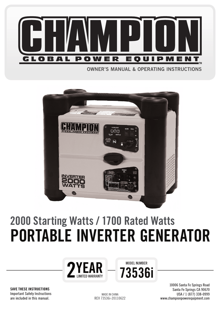 Champion 2000 watt portable generator. Maybe you would like to learn more about one of these? Check spelling or type a new query. We did not find results for: